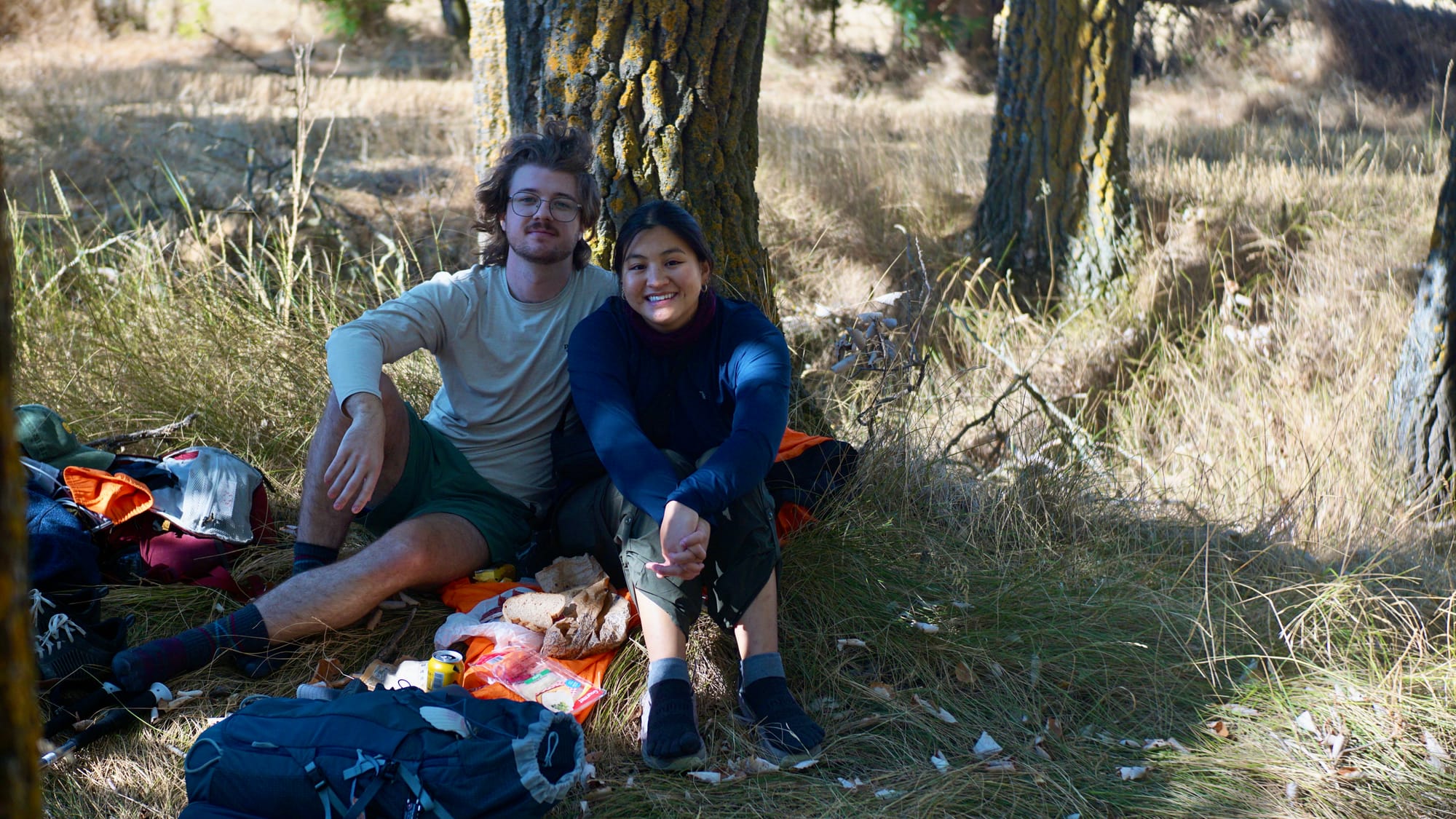 At around 11am, we found a group of trees with a grass clearing in the center that we decided to stop and have a picnic lunch at, since we brought bread and meat and cheese. We set down Tovin's sleeping bag and had some lunch. It was really yummy, and it was nice to just lay against the trees in the grass and enjoy the day together. After we were done with our rest and extra long lunch, we finally got back on the road.