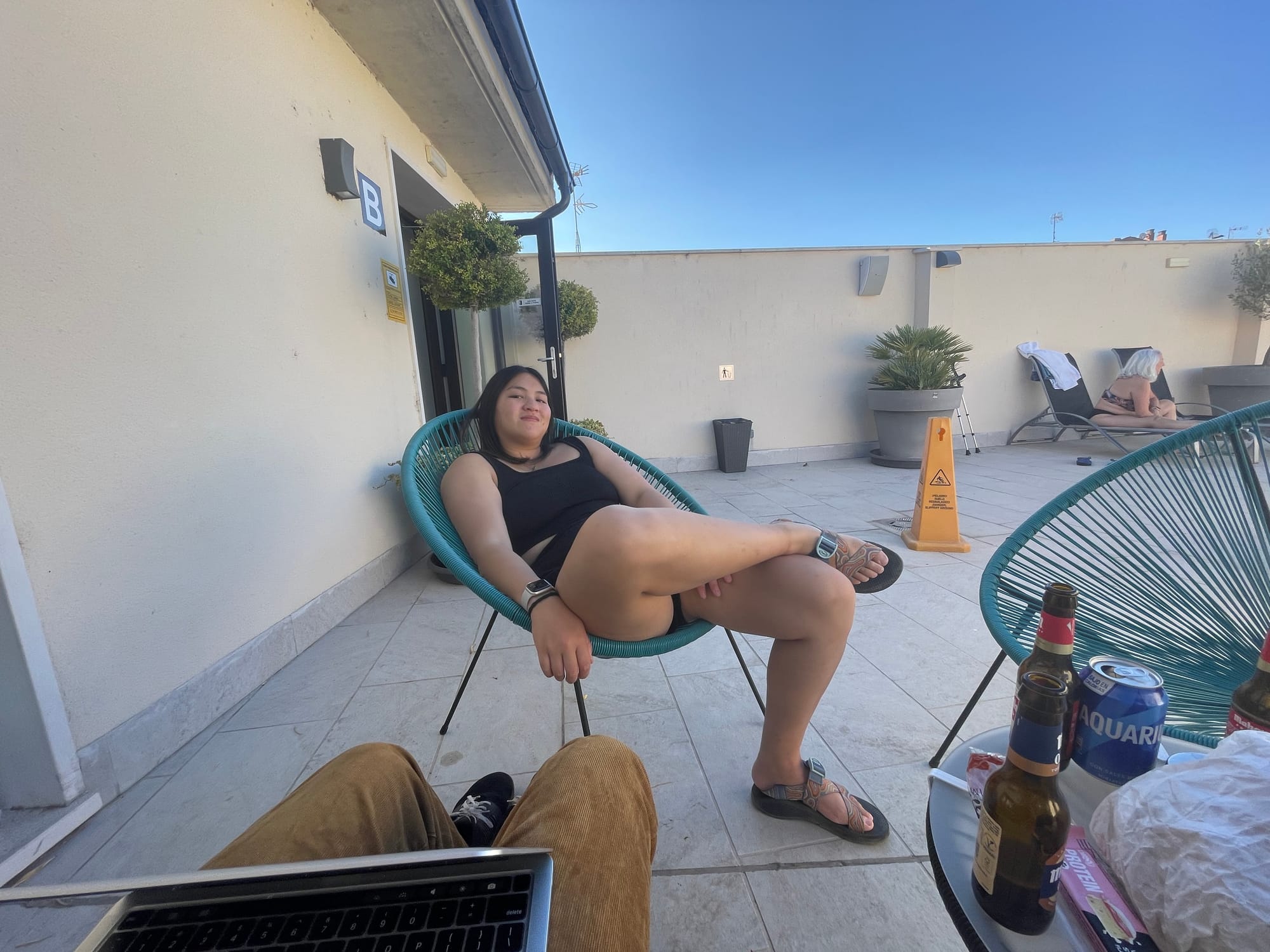 We hung up our clothes on the drying rack, and then we found a shady corner with some nice seats to sit together for a few hours. I wrote a bit on my journal, got a foot massage from Tovin, and watched some TikToks. After a while, the clothes rack kept falling over, so Tovin ended up just bringing our clothes back to our room since it was pretty much dry anyway. He also went to the bar downstairs and got us some drinks and we sat together on the terrace for a while.