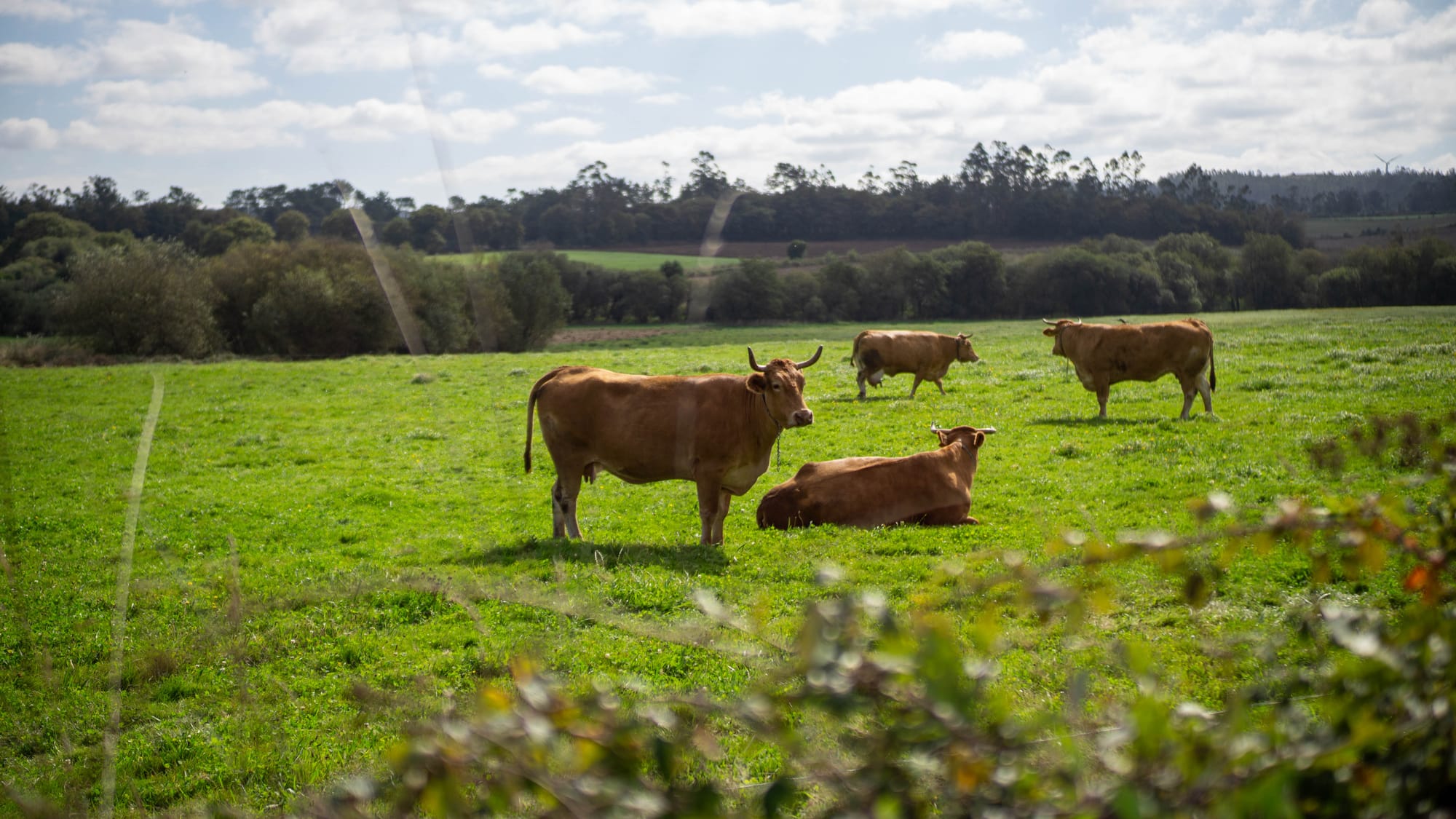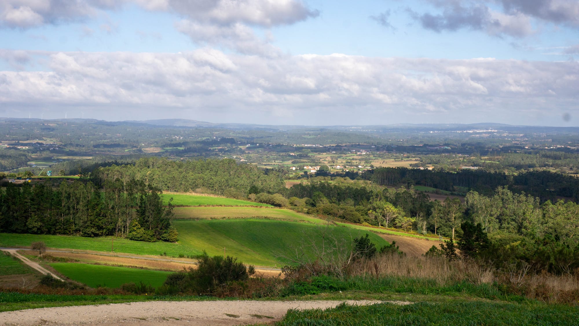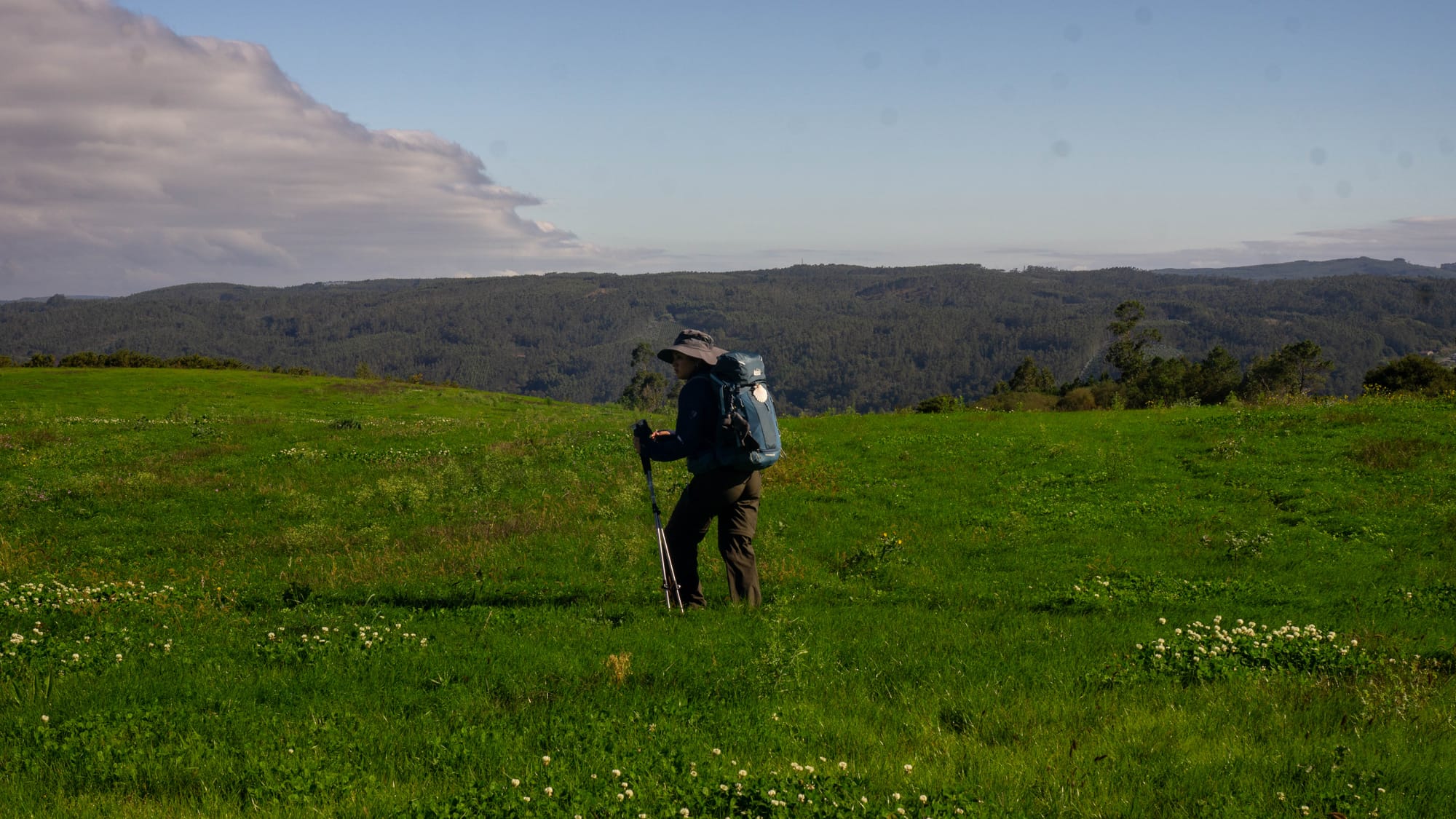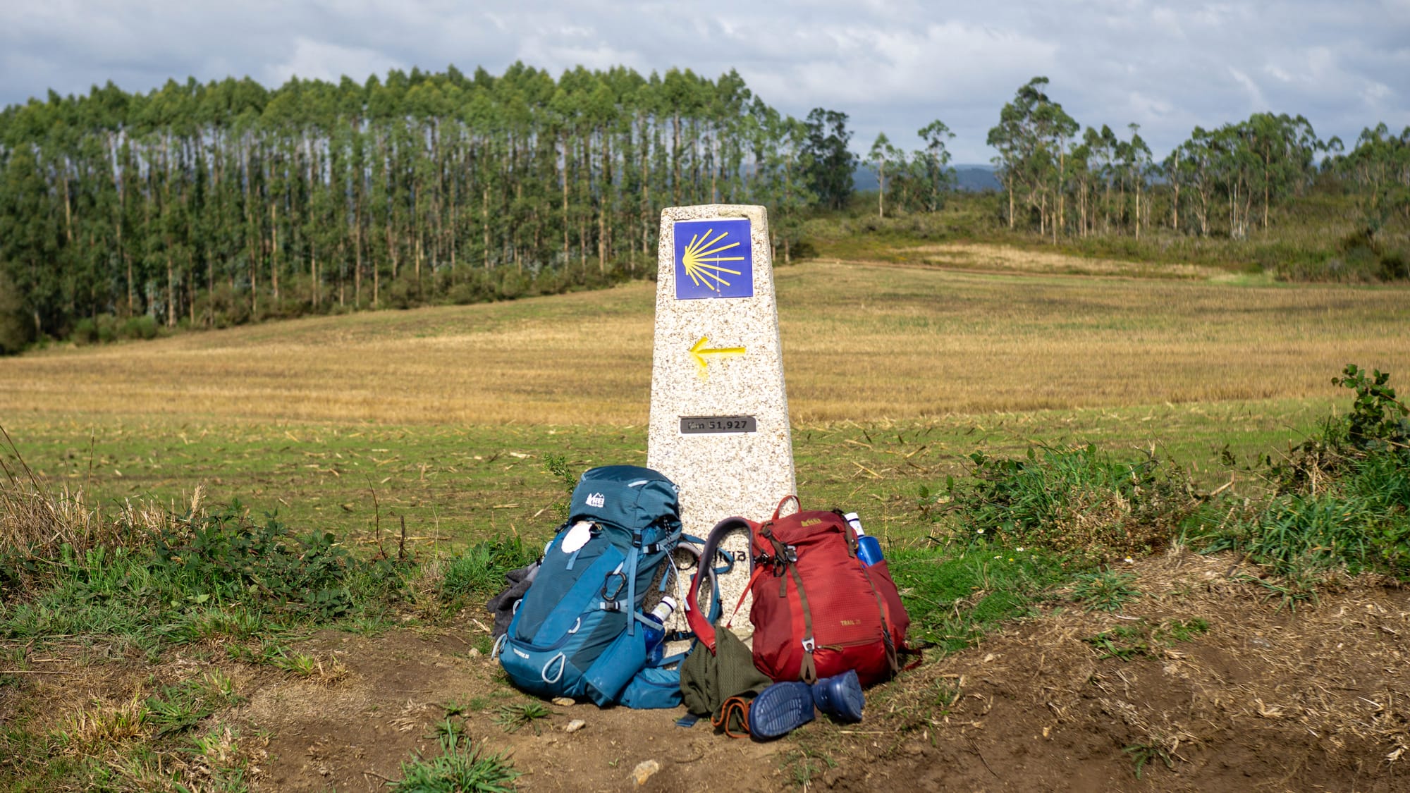 We started out hiking out of town, and it was immediately a lot of uphill, which we were not happy about. We got about a half mile in, and then I let Tovin carry my pack for me which helped a lot. Eventually we got to a café where I got a tortilla and a café con leche, and Tovin got an orange juice and a big piece of toast with oil and pureed tomato and ham on top. Both were good, and then we used the bathroom before setting out again.